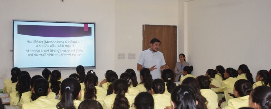 On 11th July 2025 (Friday), a knowledge-enhancing guest lecture was organized for the S.Y. B.A. Semester 3 Psychology students at Nandkunvarba Mahila Arts College.In this session, Dr. Jayesh Sarvaiya, Assistant Professor in the Department of Psychology at Government Arts & Commerce College, Palitana, delivered an insightful and analytical lecture on the topic “Metabolism as a Component of the Body’s Internal Environment and Its Impact on Behavior.”